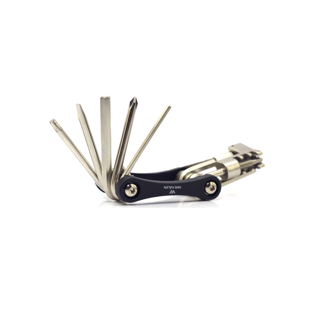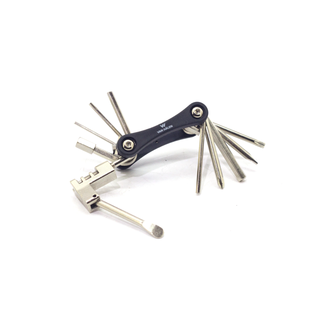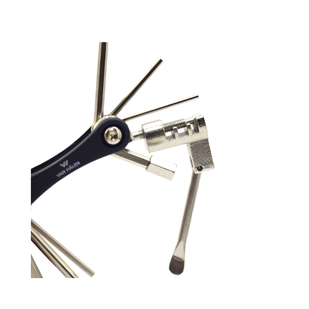 La Multiherramienta Van Halen VAN454 TOOL 12 IN 1 es una solución compacta y versátil para ciclistas y mecánicos. Incluye 12 herramientas esenciales como llaves Allen de varios tamaños, destornilladores, llave de cadena y más, todo en un diseño ergonómico y resistente. Fabricada en acero de alta calidad, garantiza durabilidad y eficiencia en cada ajuste, ideal para reparaciones rápidas y mantenimiento en ruta.